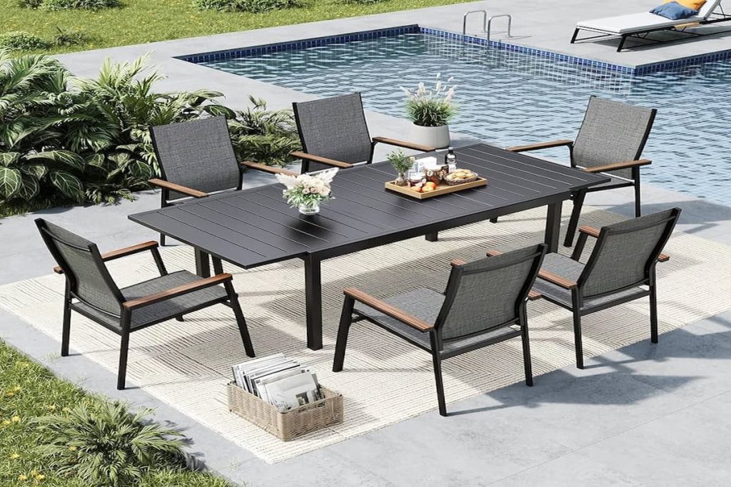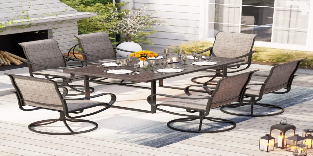 - For large outdoor areas, mix dining sets with loungers or sectionals for a complete setup.